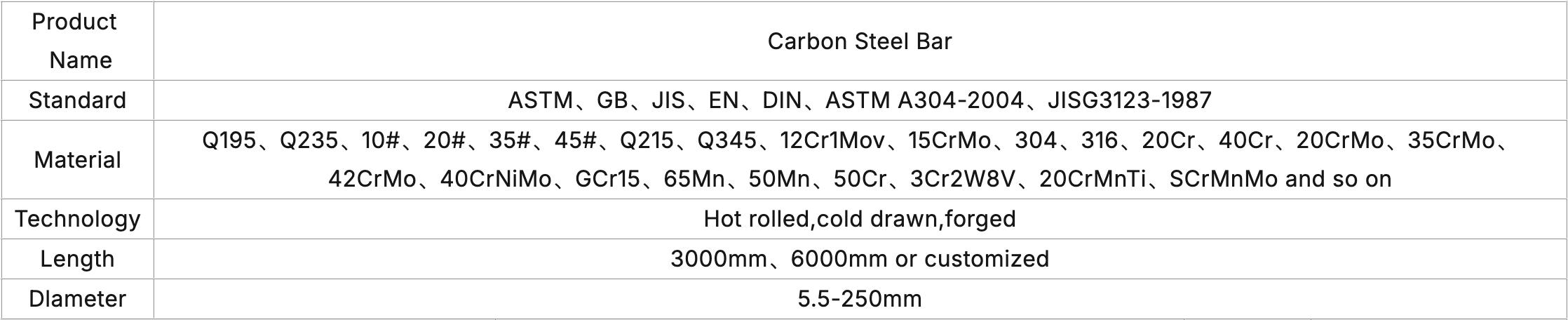 Carbon Steel Bar is a strong, durable solid steel product made from high-quality carbon steel. It offers excellent strength, hardness, and machinability, making it ideal for general fabrication, construction, and manufacturing applications. Carbon steel bar are available in various shapes, including round, flat, square, and hex, and can be produced through hot rolling, forging, or cold drawing. They are widely used in machinery parts, structural components, tools, and industrial equipment due to their superior mechanical properties and cost-effectiveness.